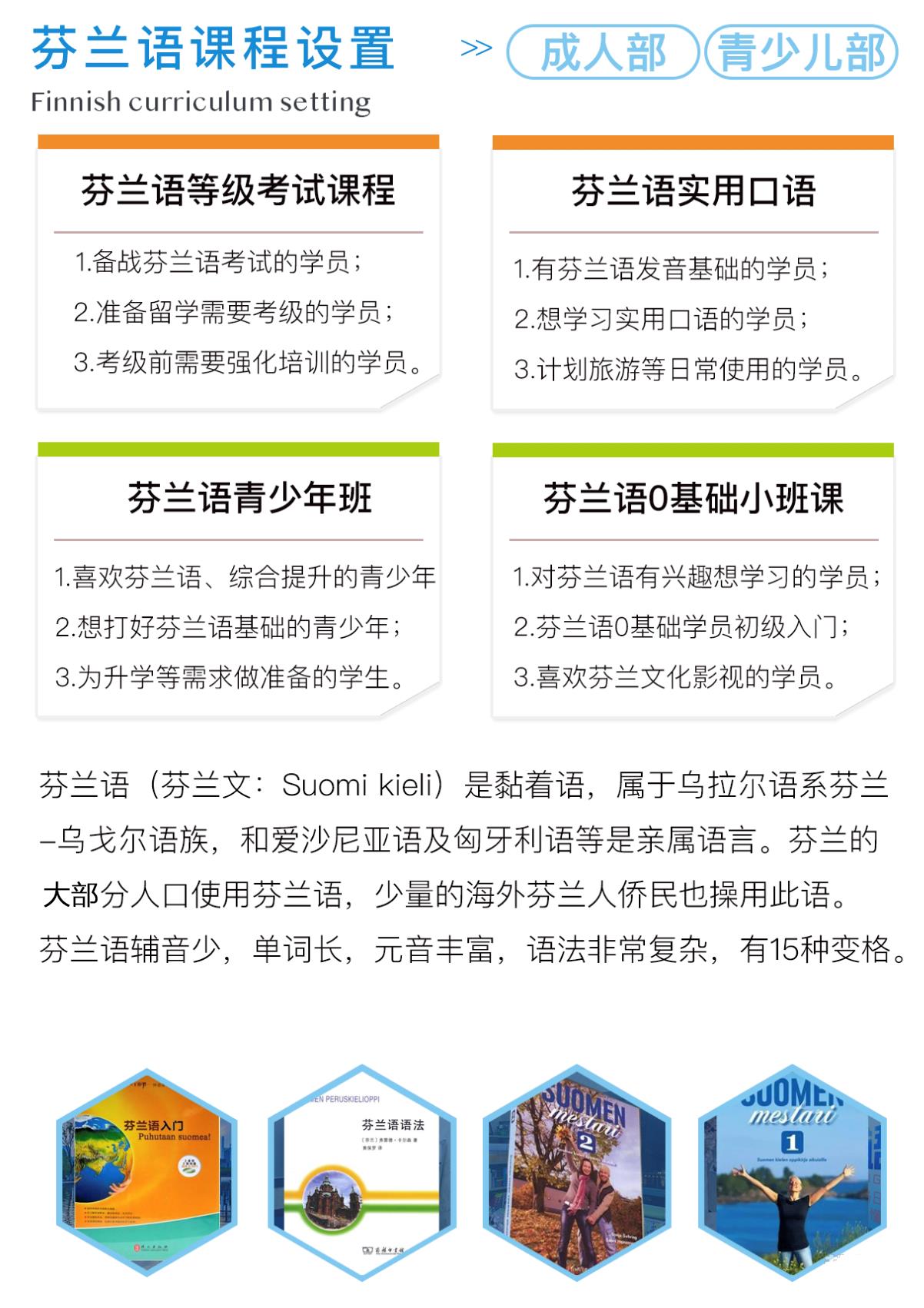 芬蘭語(芬蘭文:Suomi kieli)是黏著語,屬于烏拉爾語系芬蘭-烏戈爾語族,和愛沙尼亞語及匈牙利語等是親屬語言。芬蘭的大部分人口使用芬蘭語,少量的海外芬蘭人僑民也操用此語。芬蘭語輔音少,單詞長,元音豐富,語法非常復雜,有15種變格。