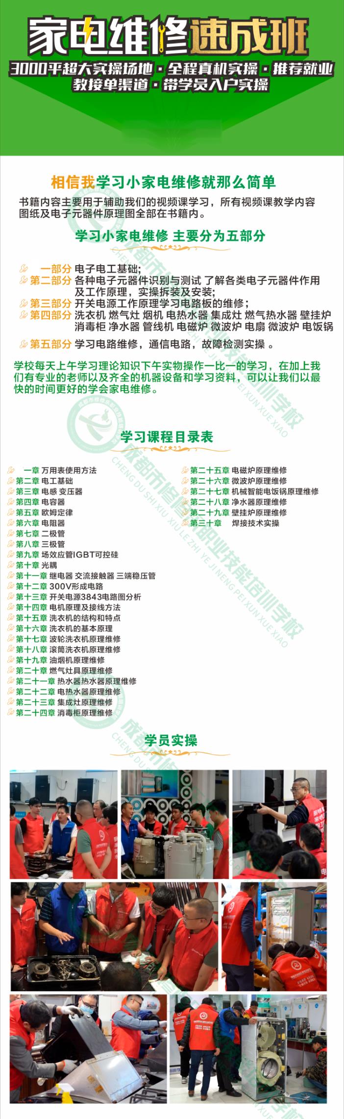 ? ? ? ? 成都市修修樂職業技能培訓學校是一所由市場監督管理局和人社局聯合批準登記的民辦職業技能培訓學校,主要專注于家用電器產品維修工、家用電子產品維修工、制冷空調系統安裝維修工、燃氣具安裝維修工、家電清洗工、家政服務員、養老護理員、育嬰師等專業的職業技能培訓,是國內為數不多的集全品類家電維修、清洗、安裝、家政、護理為一體的一站式職業技能培訓學校。? ? ? ? 學校擁有雄厚的師資力量,既有20年以上家電維修經驗豐富的專家級實操老師團隊,又有芯片級電路板維修等方面造詣頗高的理論老師團隊,同時也擁有家政、育嬰和護理方面的高級講師數名,學校所有學員培訓的教學大綱、計劃和內容均按國家頒布的《職業技能標準》要求嚴格執行,教學方式遵循30%理論學習+70%動手實操,學校頗具規模和實力,擁有12間計600平的多媒體理論教室以及國內少有的1500平配套設施完善的實操區域,可一次性提供100人實訓實操的教學工位,實操區內各種維修工具、家政工具及各類模型器材完備,擁有覆蓋國內市場90%以上的最新大小家電及燃氣具實操產品近500余臺(套),所有實操設備均實現水、電、氣三通,完全模擬家庭日常使用狀態及故障展示,特色是,校內擁有其它培訓機構不具備的高層房屋模擬場地,精確還原高空作業(空調)安裝及維修場景。? ? ? ? 學校實操按培訓品類共分為6大區域①制冷家電維修實操區(冰箱/空調等)②廚衛小家電維修實操區(洗衣機/廚房電器/熱水器/各類小家電等)③黑色家電維修實操區(液晶電視/音響/蒸烤箱等)④家電清洗實操區(空調/洗衣機/冰箱/地暖/熱水器/煙機灶具/集成灶等)⑤各類產品安裝實操區(空調/移機/彩電/廚房電器/衛浴/水電/凈水等)⑥家政服務及護理實操區。自建校以來,以雄厚的師資力量,大量齊全的實操設備,以同行業不具備的“超大實操場地”“超多實操設備”“水電氣三通”“高空模擬安裝”等實操優勢獲得了眾多學員的好評,甚至吸引了不少在其它培訓機構花了學費又沒有學好的學員重新回爐到我校學習。? ? ? ? 經多輪考察和專家組評估,現我校已成為四川省家用電器服務維修行業協會培訓基地和戰略合作伙伴,同時也是四川多家一線品牌維修安裝人員的代培訓機構,凡經我校培訓畢業的學員除自主創業外,一律由家電協會推薦就業,就業單位均是一線大品牌的售后服務單位(如,美的、海爾、格力、長虹等),月收入過萬不是夢,優秀的學員還會重點培養成為各服務網點負責人。? ? ? ? 歡迎想學一技之長,想改善就業,想提升創業能力,想快速擁有好工作的有志之士,到我校參觀考察學習!