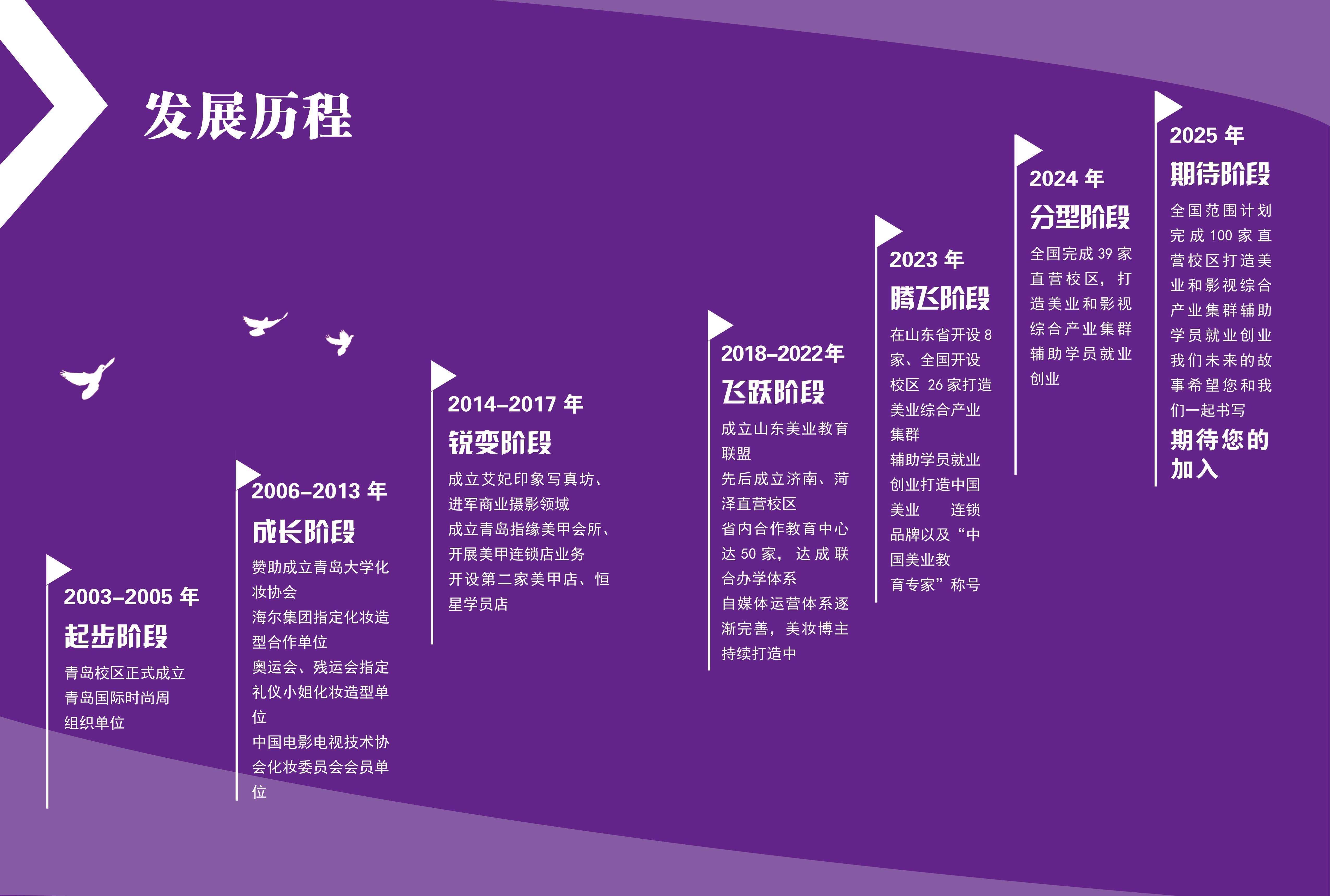紫緣教育集團(tuán)創(chuàng)立于2003年,是國(guó)內(nèi)資質(zhì)最老的一批美業(yè)培訓(xùn)機(jī)構(gòu)之一。在過(guò)去的22 年,中國(guó)發(fā)生了翻天覆地的變化,美業(yè)和美業(yè)培訓(xùn)機(jī)構(gòu)也在市場(chǎng)經(jīng)濟(jì)的變革中不斷推陳出新,完善自我。紫緣也看到大量同期的培訓(xùn)機(jī)構(gòu)因不符合市場(chǎng)發(fā)展的要求而被淘汰。經(jīng)過(guò)22年的發(fā)展,紫緣重視教學(xué)、教研、技術(shù)研發(fā),已成為國(guó)內(nèi)美業(yè)教育培訓(xùn)領(lǐng)域的首部梯隊(duì)。我們的培訓(xùn)課程主要有化妝、形象設(shè)計(jì)、美甲美睫、美容美發(fā)半永久紋繡、攝影攝像等美業(yè)培訓(xùn)及美業(yè)相關(guān)產(chǎn)業(yè),每一個(gè)板塊都經(jīng)過(guò)了22 年的積累和沉淀,整個(gè)教學(xué)、就業(yè)體系非常完善。紫緣不僅是自營(yíng)教育培訓(xùn),而且為國(guó)內(nèi)大量教育培訓(xùn)機(jī)構(gòu)提供服務(wù)。包括為其他機(jī)構(gòu)提供廣告投放、自媒體運(yùn)營(yíng)、課程輸出、師資培訓(xùn)、客服外包、員工培訓(xùn)等支持工作,是國(guó)內(nèi)美業(yè)教育S2B2C模式的踐行者。目前我們?cè)谌珖?guó)有40余家直營(yíng)分校,先后在山東省濟(jì)南、菏澤、臨沂、濰坊、煙臺(tái)、聊城、濟(jì)寧、泰安、德州,以及河北省石家莊市、保定市,天津直轄市,河南省鄭州市、周口市,廣東省廣州市、深圳市,湖南省長(zhǎng)沙市、衡陽(yáng)市,山西省太原市,四川省成都市,安徽省合肥市、阜陽(yáng)市,浙江省寧波市、嘉興市,遼寧省沈陽(yáng)市,陜西省西安市,貴州省貴陽(yáng)市,江蘇省南京市、徐州市,云南省昆明市,廣西省南寧市,江西省南昌市、贛州市,黑龍江省哈爾濱市,重慶直轄市等地開(kāi)設(shè)直營(yíng)校區(qū),學(xué)校教師突破1000 人,每年服務(wù)的學(xué)生和家長(zhǎng)超 2萬(wàn)人。[企業(yè)愿景]打造中國(guó)美業(yè)教育專(zhuān)家[企業(yè)使命]圓夢(mèng)學(xué)員 成就員工[企業(yè)價(jià)值觀]客戶(hù)為先 合作共贏 精益求精 擁抱變化