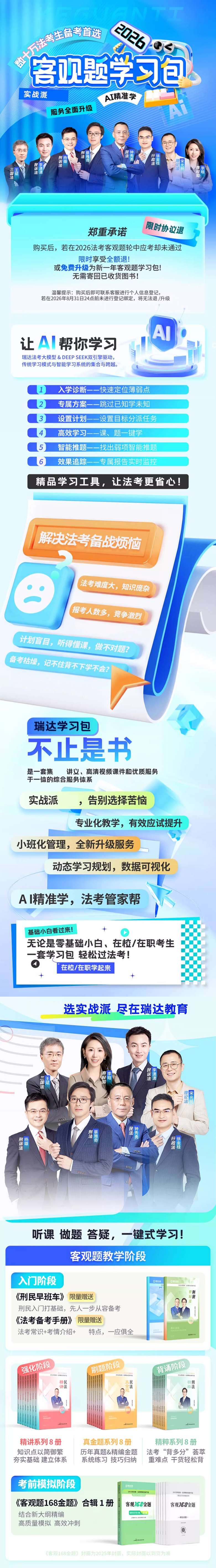 瑞達(dá)成泰教育科技有限公司,是一家集國(guó)家法律職業(yè)資格考試、全國(guó)法律碩士聯(lián)考培訓(xùn)于一體的教育培訓(xùn)機(jī)構(gòu),簡(jiǎn)稱“瑞達(dá)教育”。面授網(wǎng)課兼施,教學(xué)服務(wù)并重,打造師資優(yōu)勢(shì),成就考生夢(mèng)想。瑞達(dá)教育始終致力于用專業(yè)的圖書(shū)、專業(yè)的課程、精準(zhǔn)的內(nèi)容、精彩的講授,為每一位瑞達(dá)學(xué)員提供更加優(yōu)質(zhì)的教育培訓(xùn)服務(wù)。