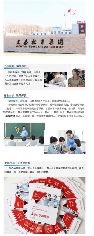 文泰教育集團創辦于2003年,目前擁有哈爾濱市龍江旅游中等職業技術學校、哈爾濱市文泰技工學校、高中升學部等5所學校,現有校區2個,另有大專校區正在規劃建設中。集團辦學實力雄厚,辦學規模日益壯大。